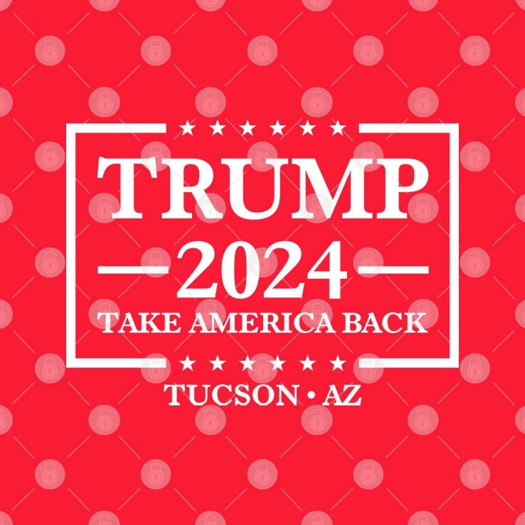 The phrase “Tucson, AZ” highlights specific support within Arizona, a state known as a political battleground. This slogan reflects support for Trump’s stance on issues such as immigration, taxes, and conservative policies in swing states like Arizona, where he recently campaigned to appeal to voters ahead of the election.