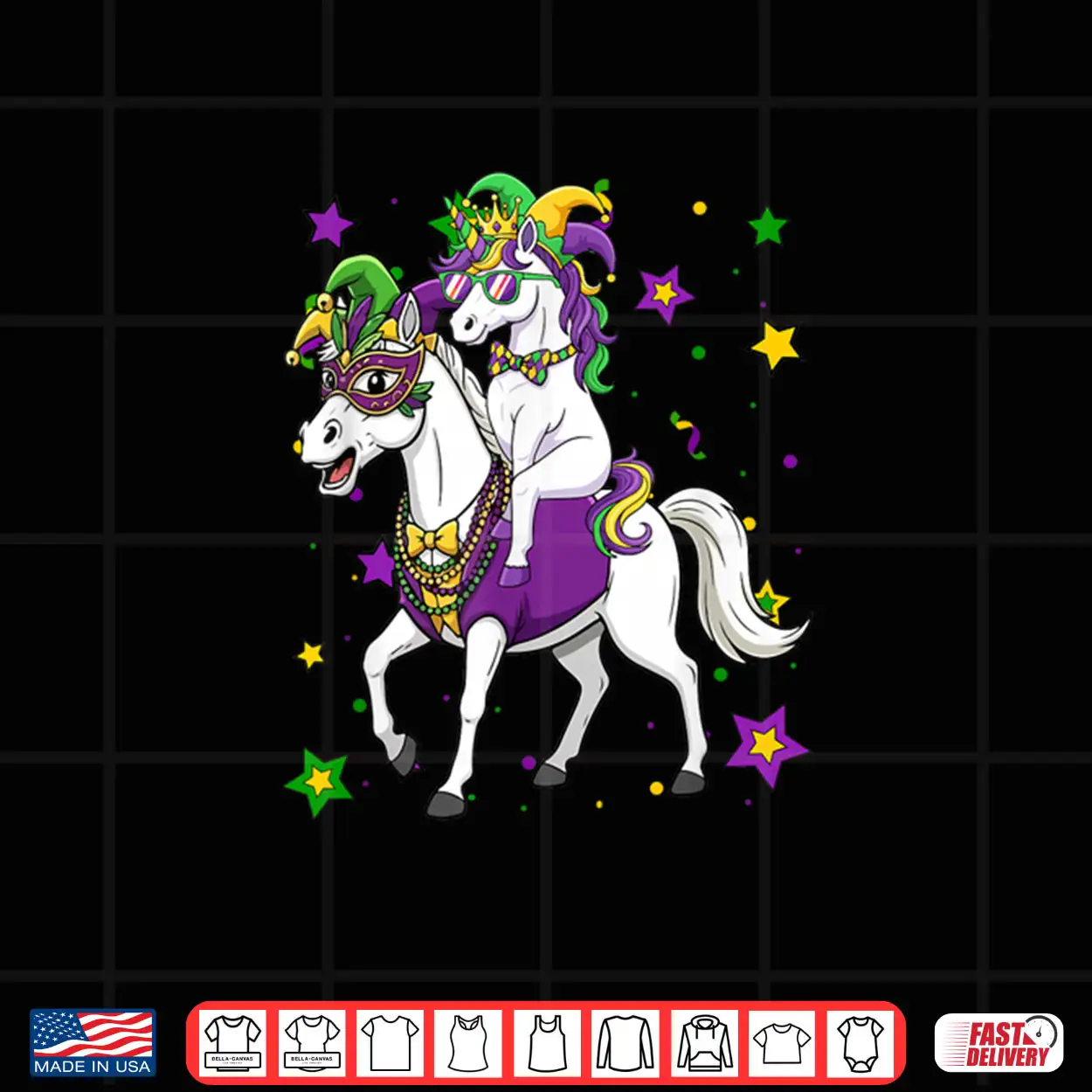 Unicorn Riding Horse Mardi Gras Beads Masked Jester Hat Shirt