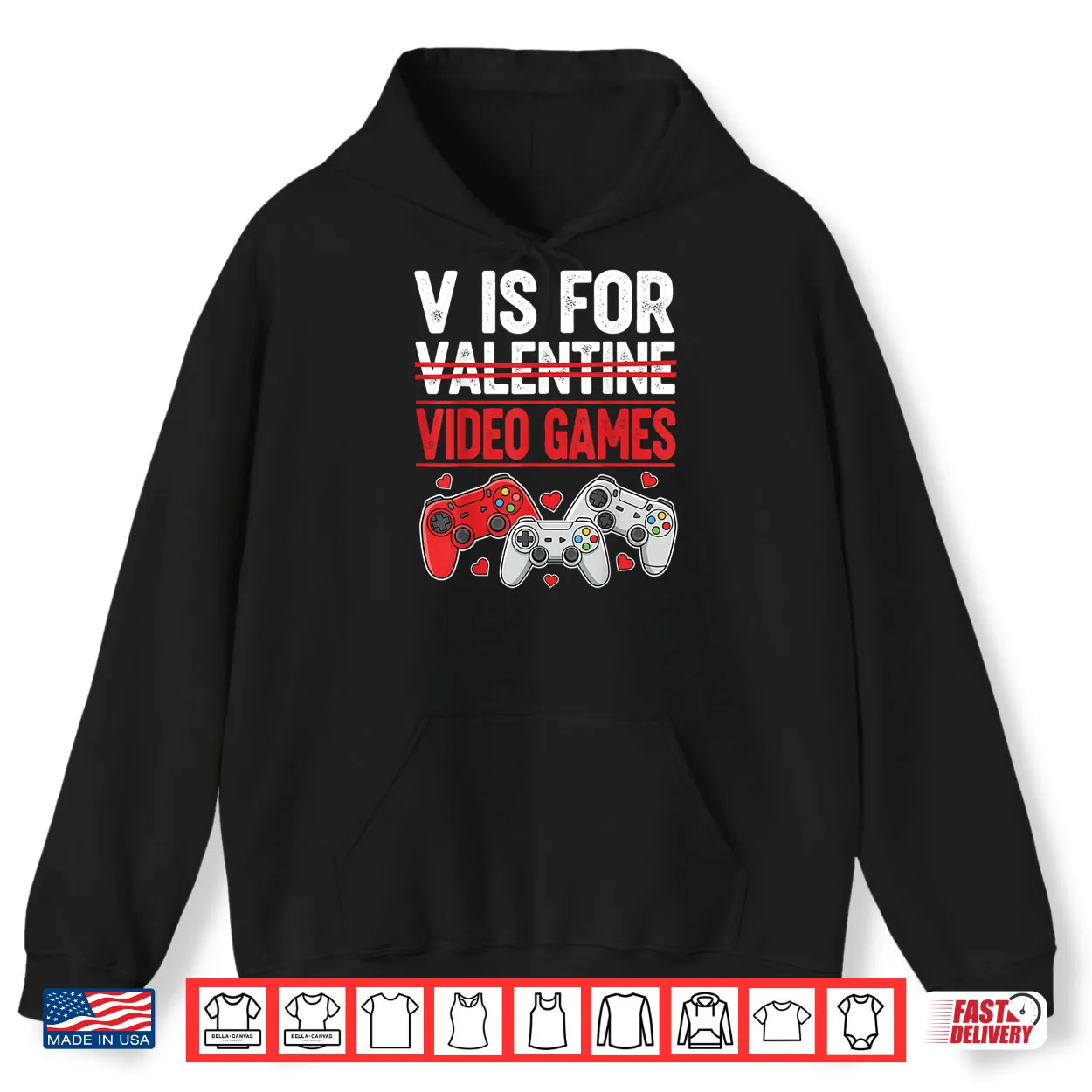 v is for video games, valentines, gamer, gaming, heart, funny quote, romance, holiday, geek, shirt