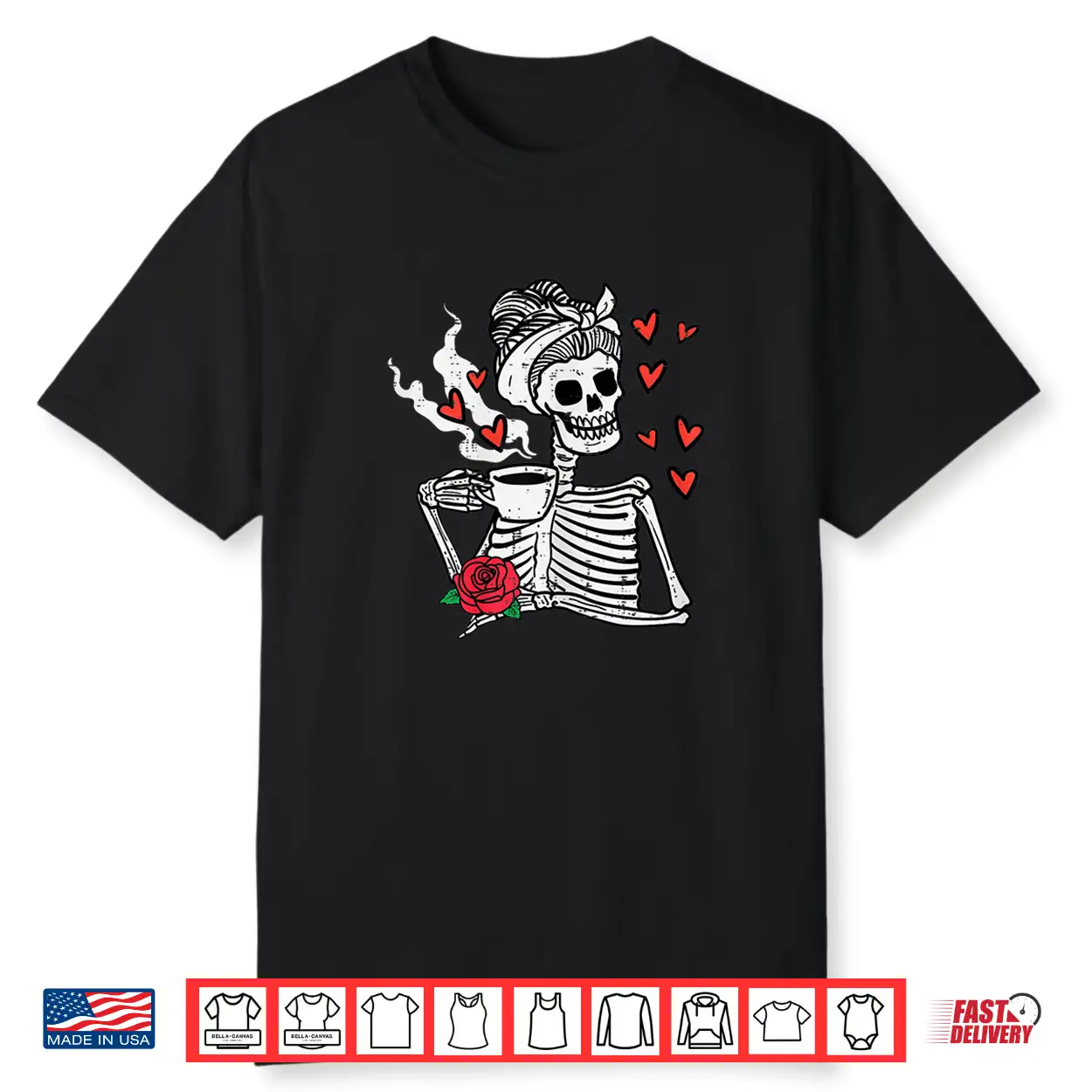 Valentines Day Woman Skeleton Messy Bun Coffee Funny Shirt