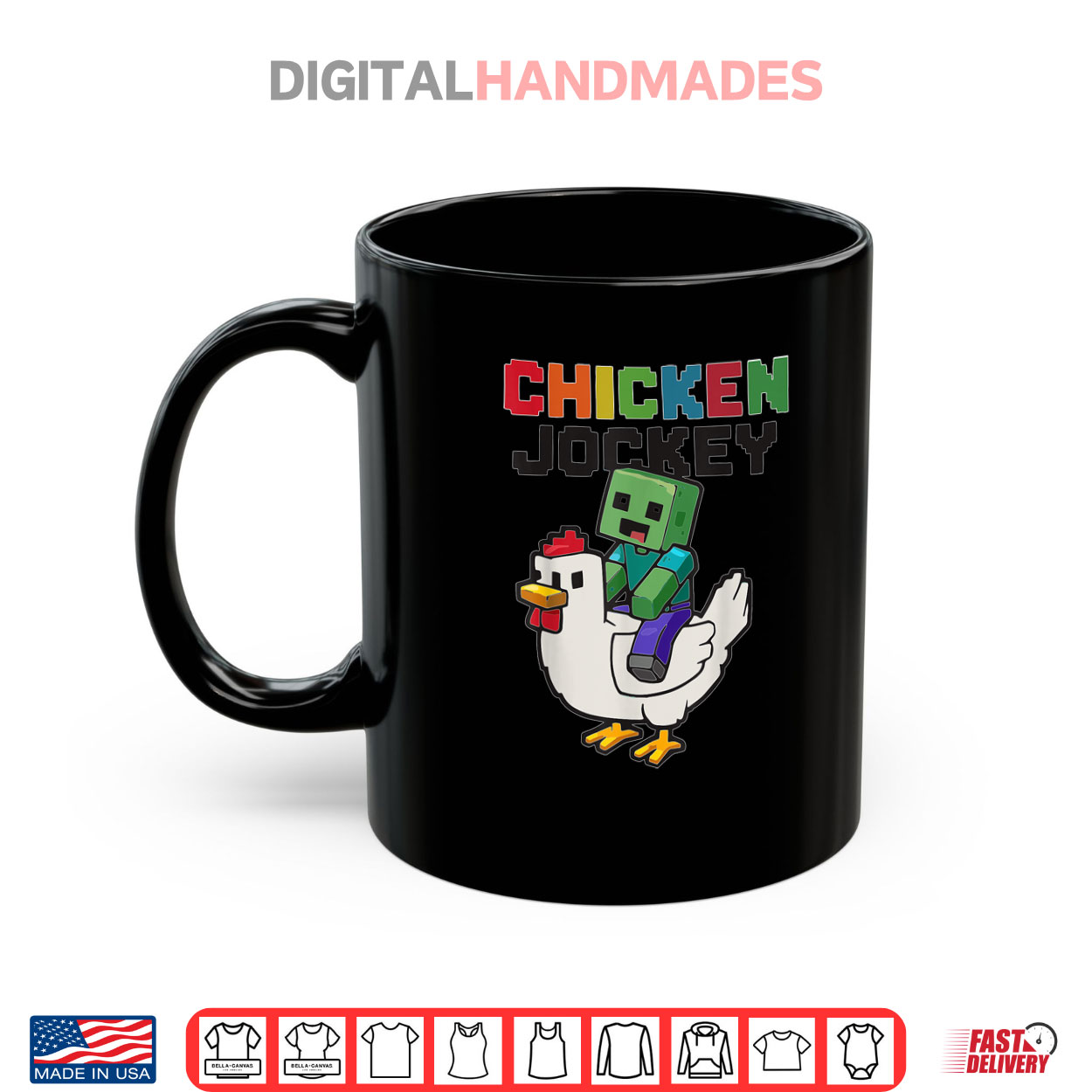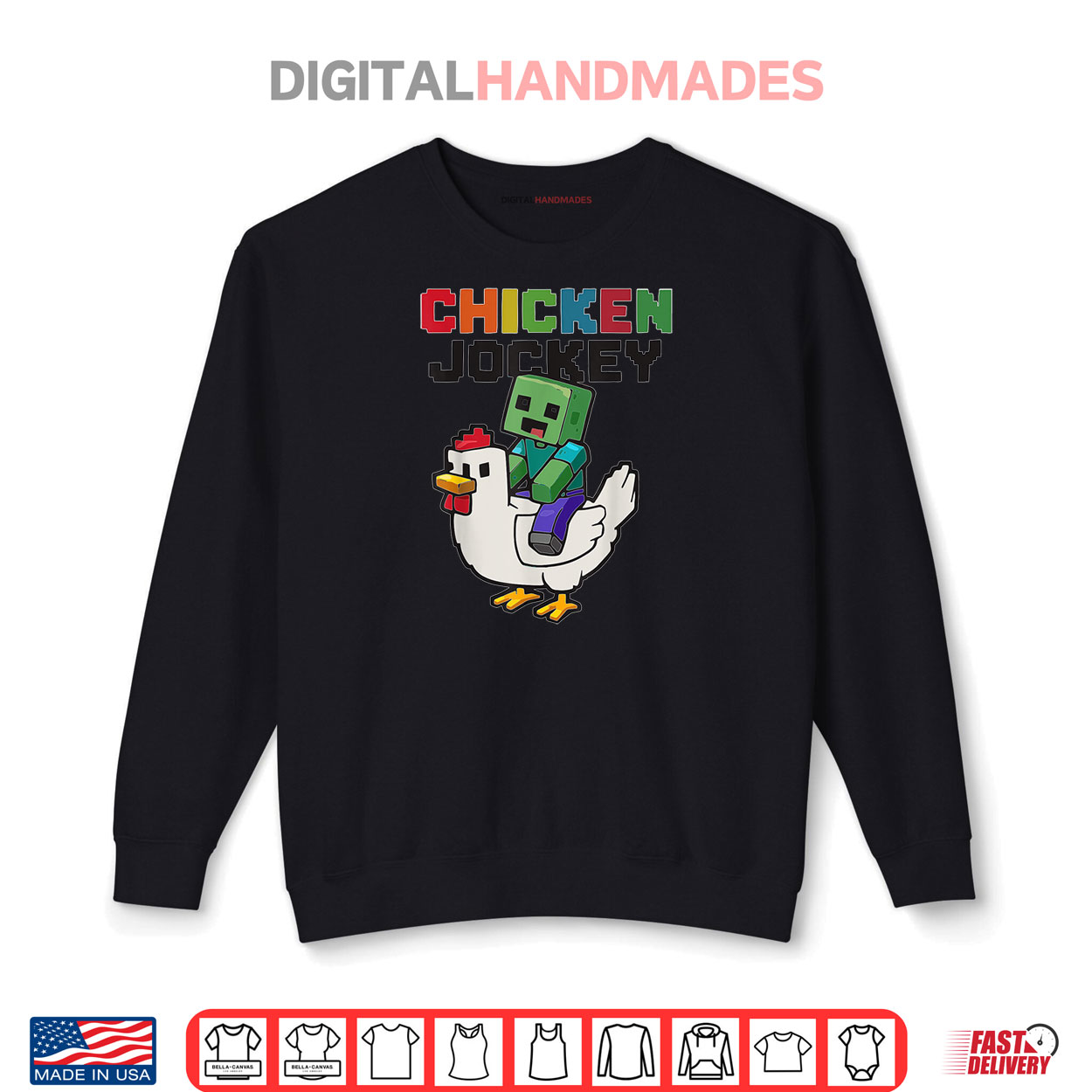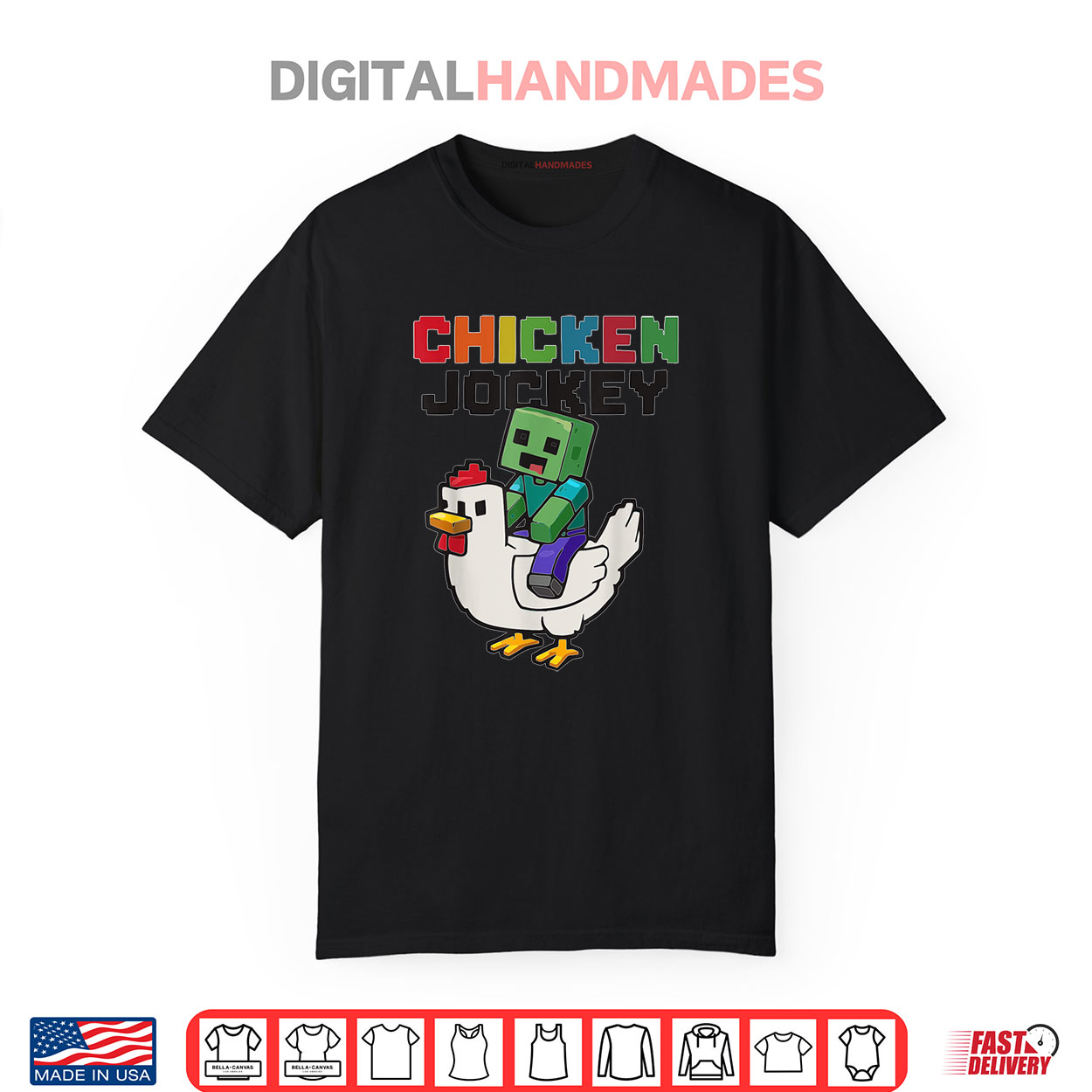 vintage chicken jockey shirt, pixel art zombie tee, retro gaming chicken shirt, minecraft-style funny gamer shirt, nerd culture mashup tee, gaming meme apparel, unique animal zombie shirt, blocky art video game tee, gamer humor pixel design, chicken riding zombie shirt