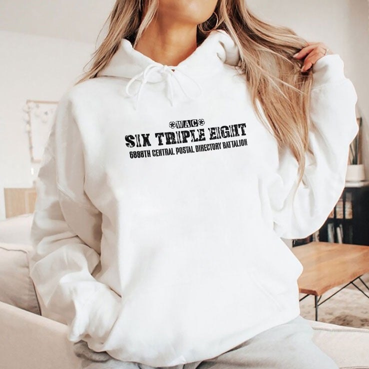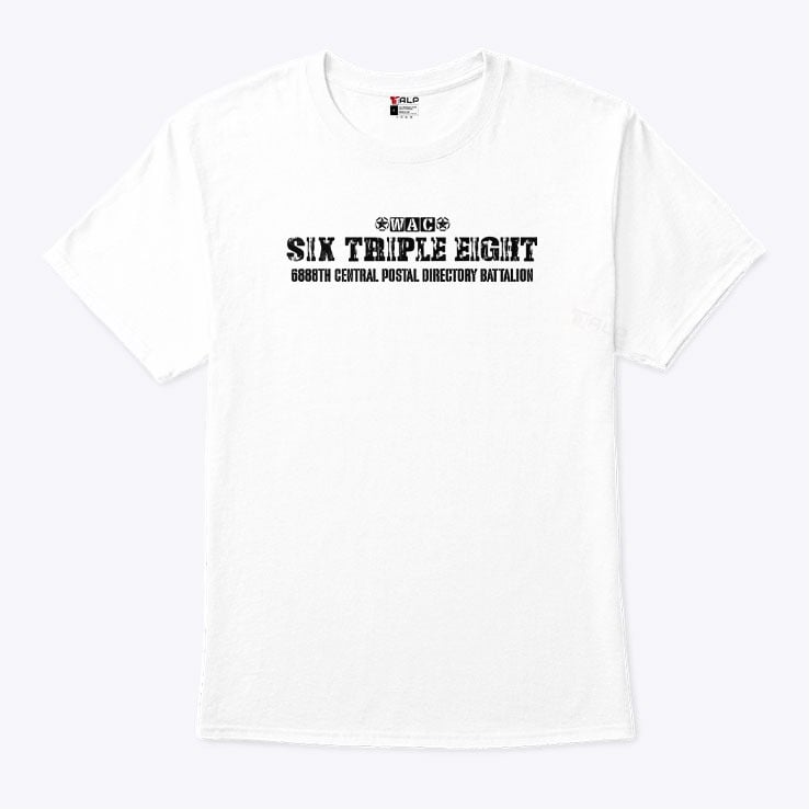 The t-shirt says “WAC 6888th Six Triple Eight 6888th Central Postal Directory Battalion”. WAC stands for Women’s Army Corps, a branch of the U.S. Army that allowed women to serve in non-combat roles during World War II.