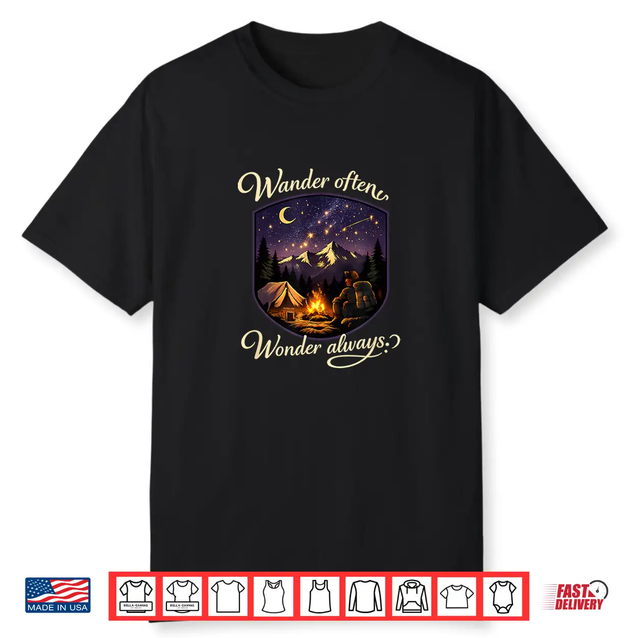 Wander Often Wonder Always Camping Mountain Badge Shirt