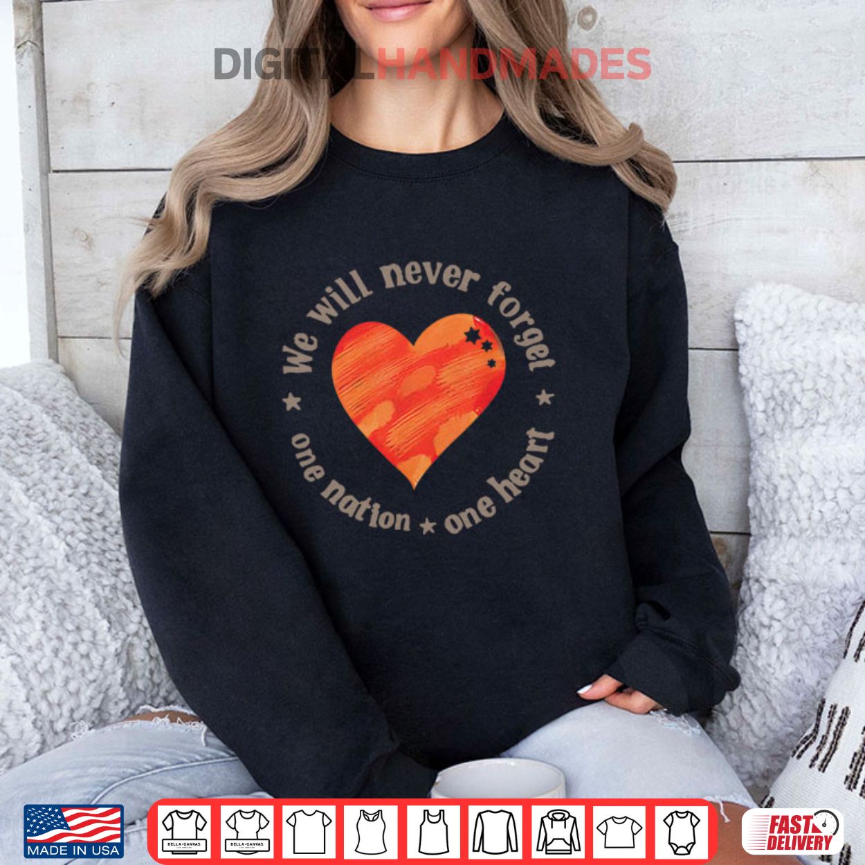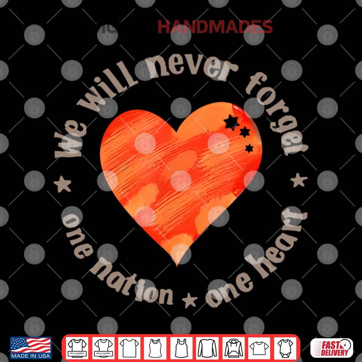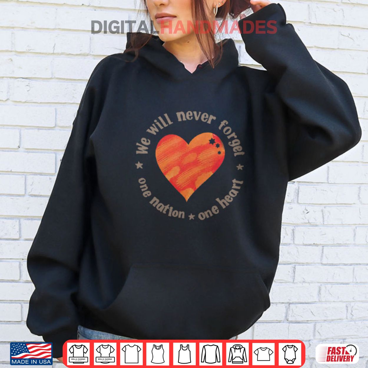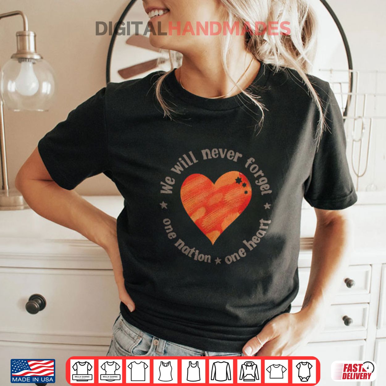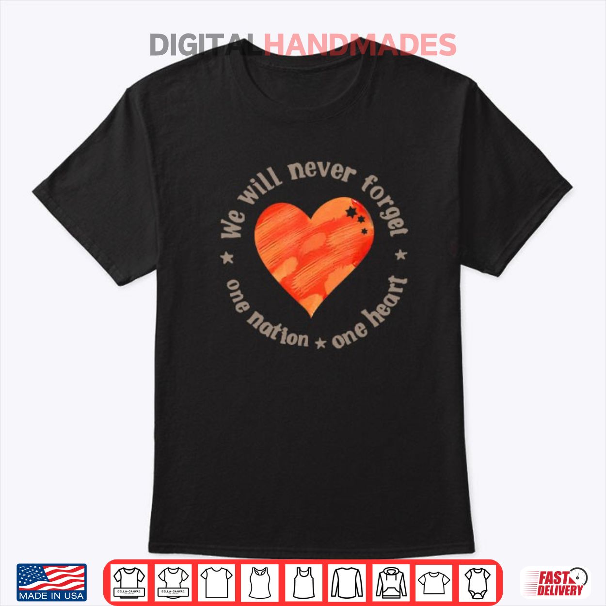 This t-shirt, featuring a heart symbol and the phrase “We Will Never Forget One Nation One Heart,” commemorates the Bibas family, who were kidnapped by Hamas during the Nir Oz attack on October 7, 2023. The attack, part of a larger conflict, resulted in the tragic deaths of Shiri Bibas and her two young children, Ariel and Kfir.