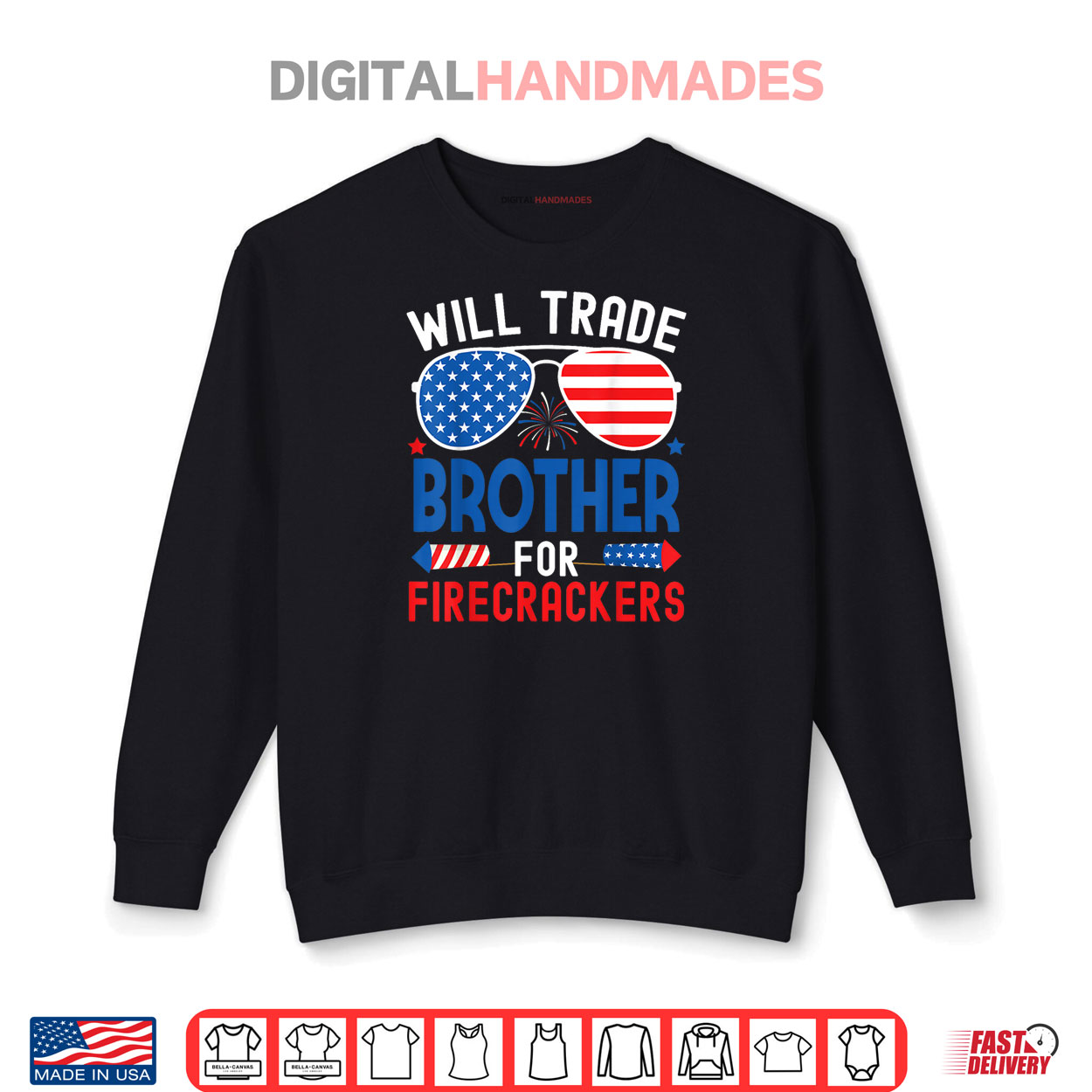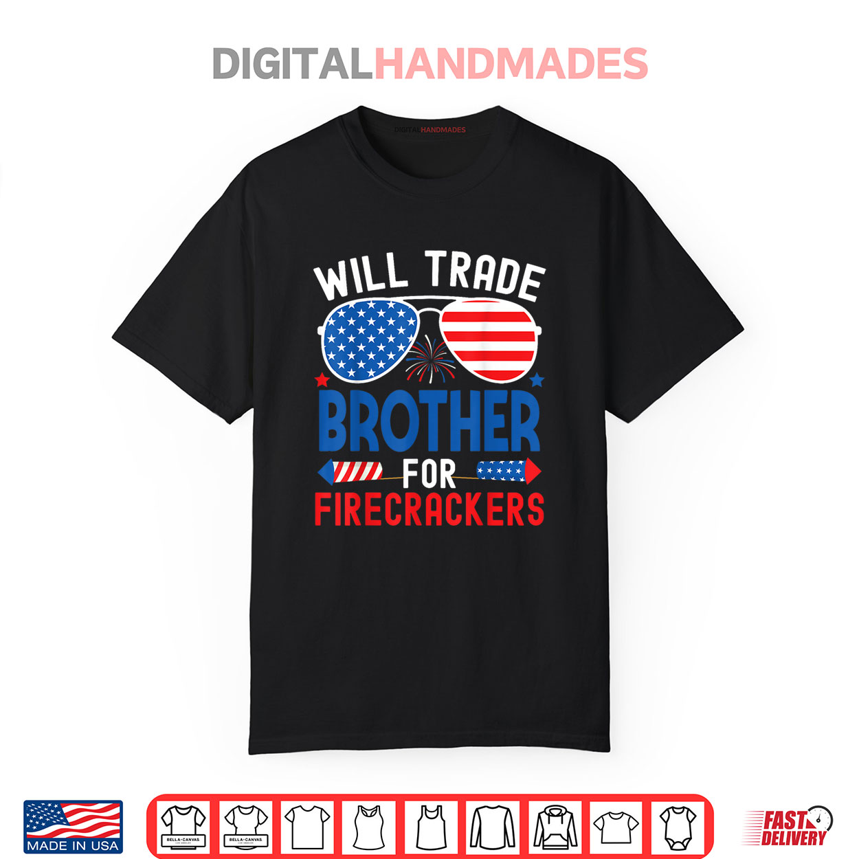 Will Trade Brother For Firecrackers Funny 4th Of July Shirt, Funny Trade Brother July 4th Tee Shirt, Sibling Humor Firecracker Joke Top Shirt, Fourth Of July Kids Barter Tee Wear Shirt, Hilarious Brother For Fireworks Fun Shirt, Independence Day Family Prank Style Shirt, Sarcastic Sister Brother Gift Proud Shirt, Funny Kids Holiday Prankster Fan Shirt, Patriotic Firework Lover Child Lady Shirt, Family Rivalry Fun Chic Shirt