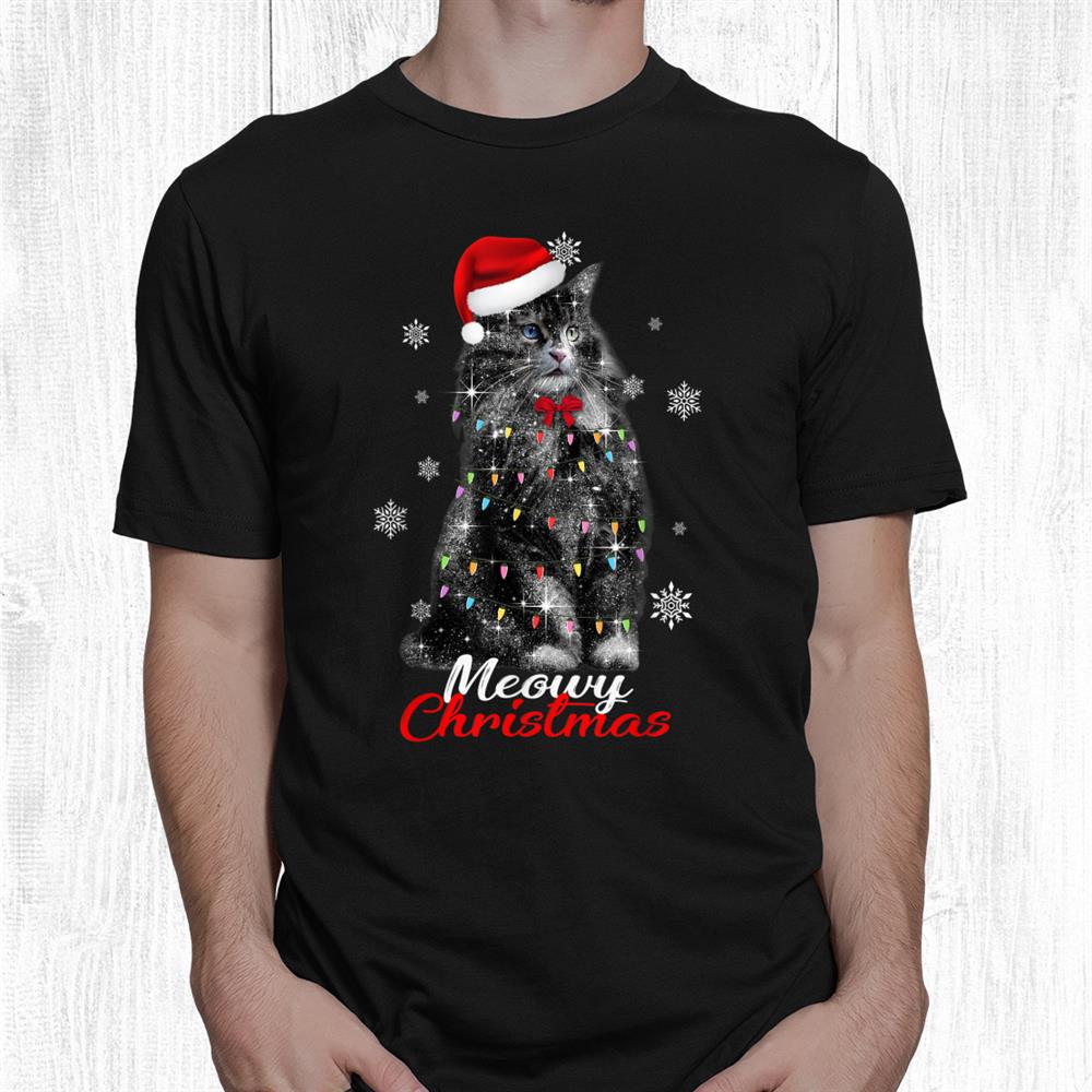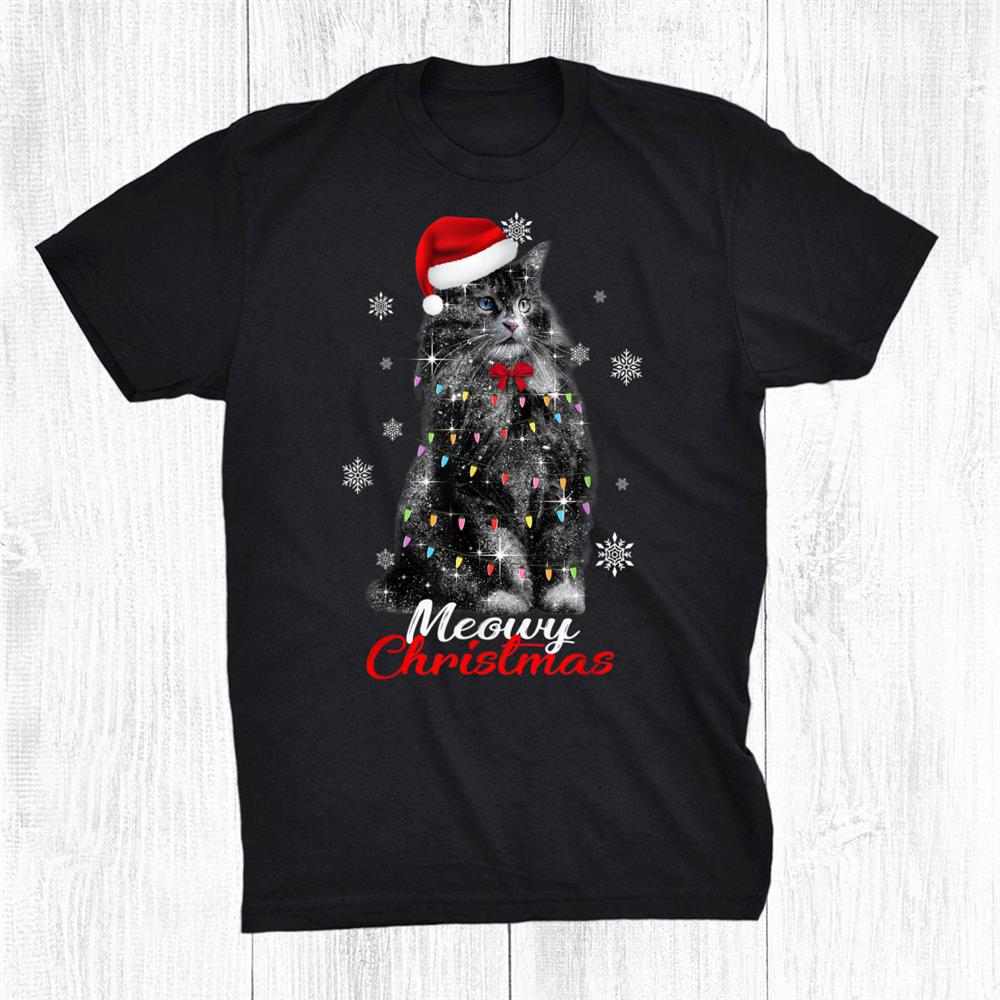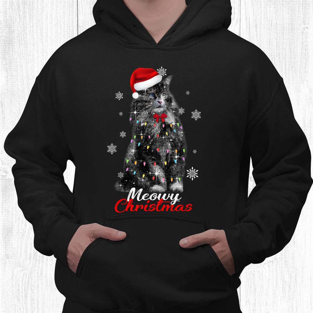 Winter Holiday Black Furry Sitting Cat Christmas Santa Hat Shirt, hoodie, sweatshirt, long sleeve and ladies T-shirt