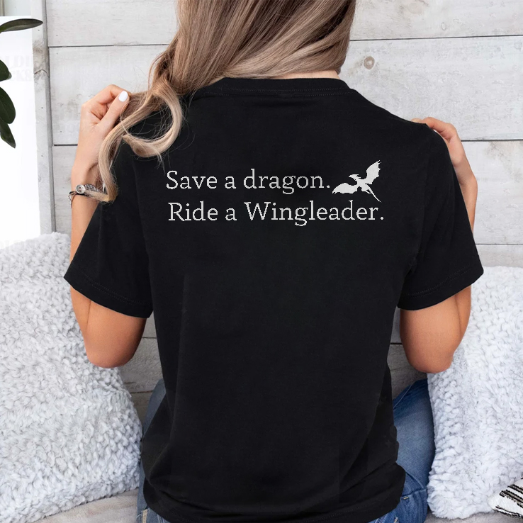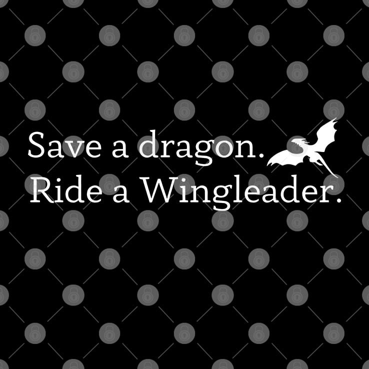 The phrase “Save a Dragon, Ride a Wingleader” is a funny twist on the relationship between riders and their dragons, with “Save a Dragon” referring to the dragons’ importance and vulnerability, and “Ride a Wingleader” highlighting the significance of Xaden’s role as both a dragon rider and leader.